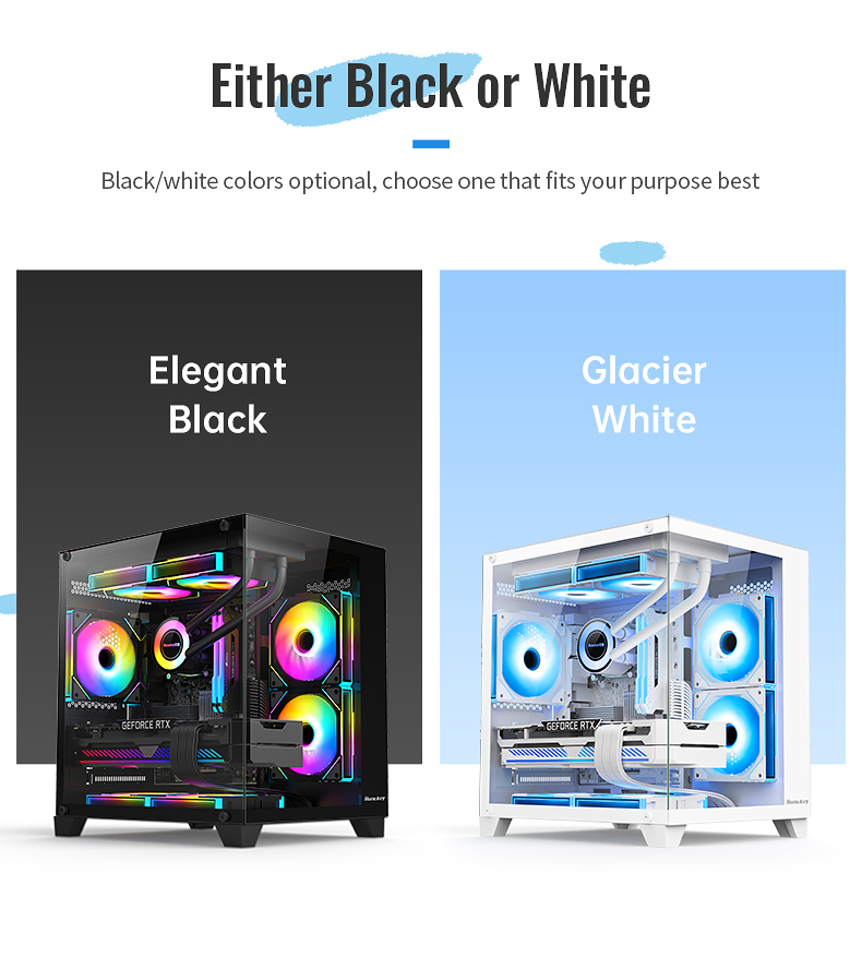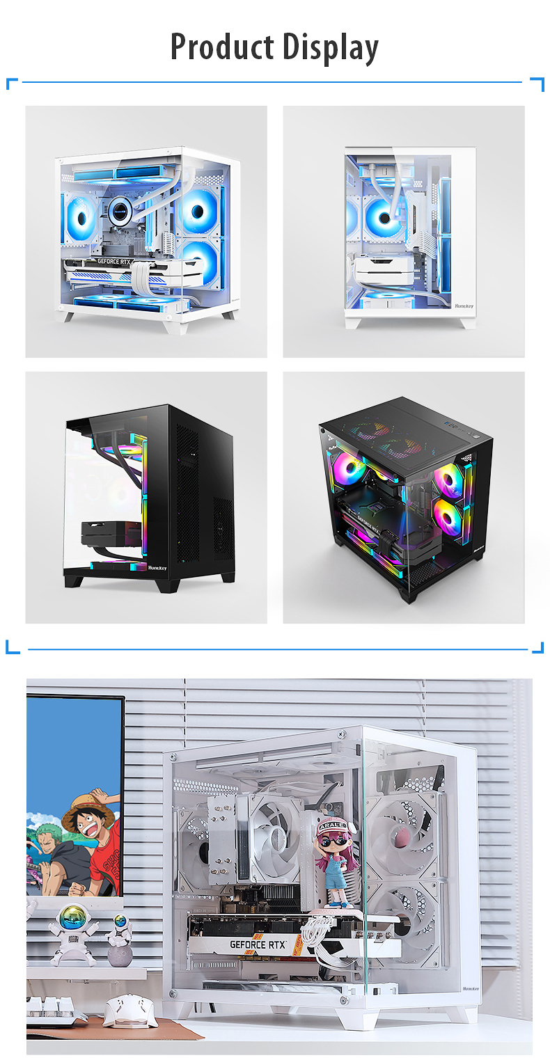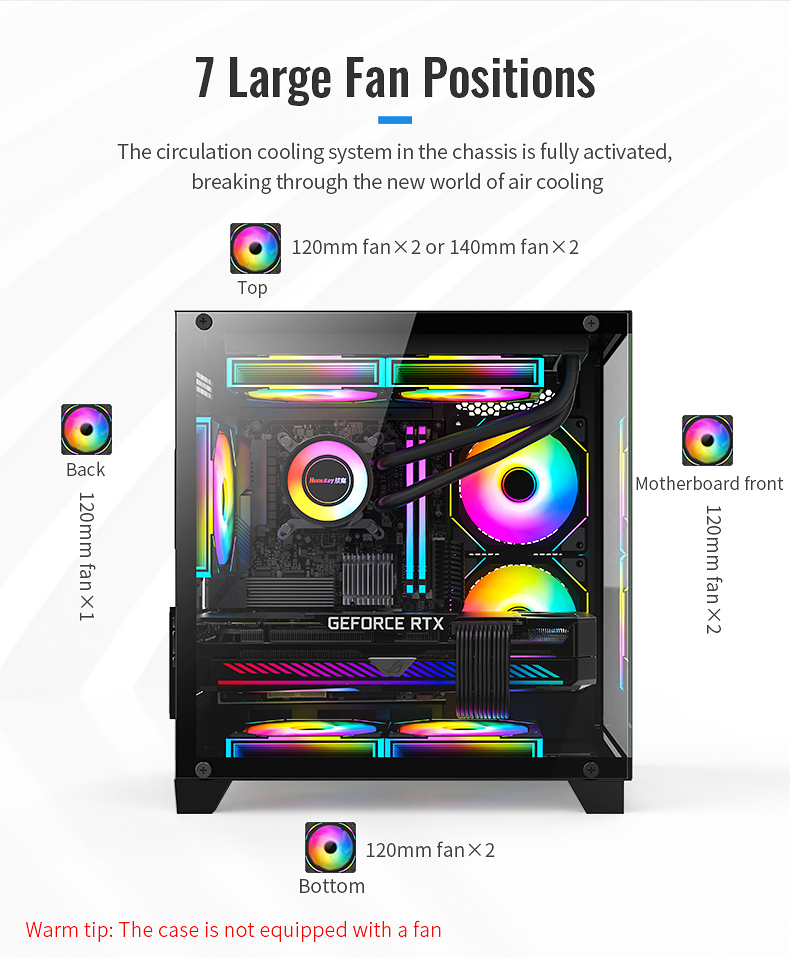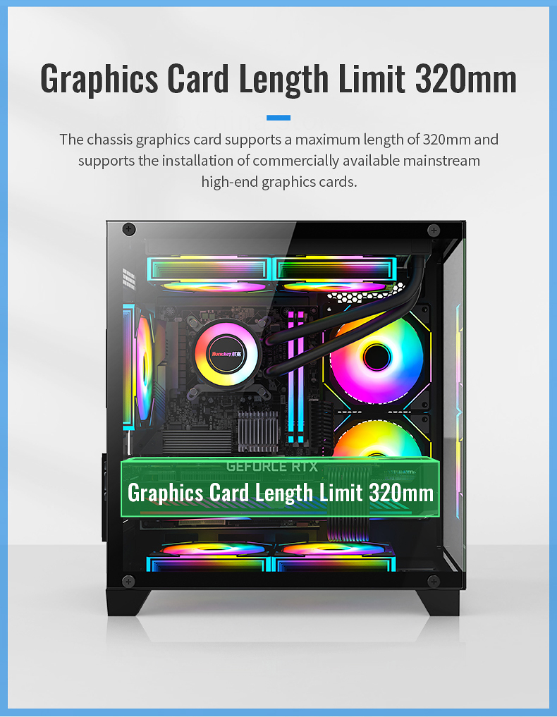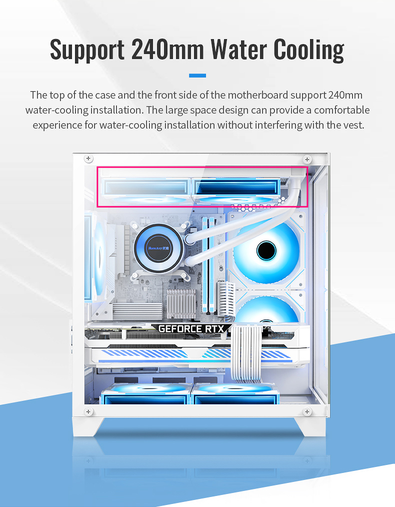| Features | 1.Support RTX4060 VGA card 2.Support 7pcs system fan Max 3.Top or Side 240 Liquid Radiator 4.Front and Left transparent glass panel |