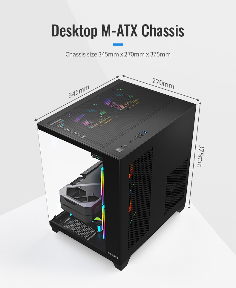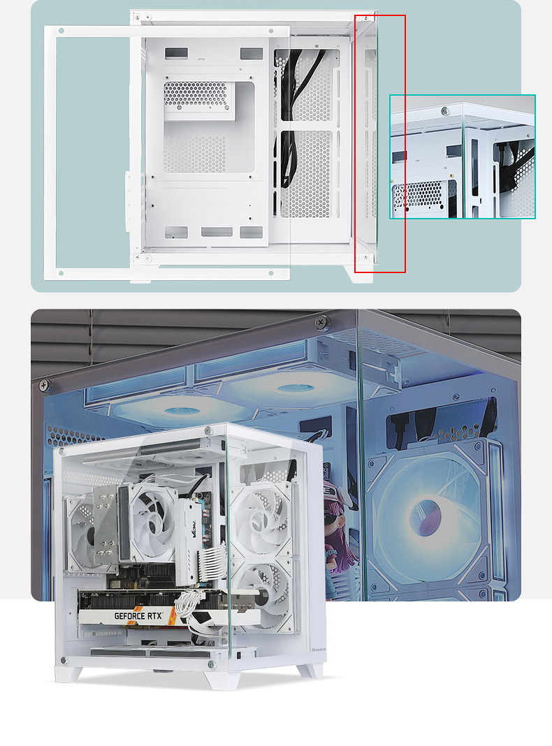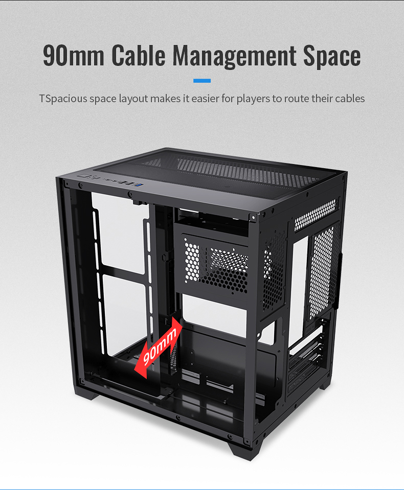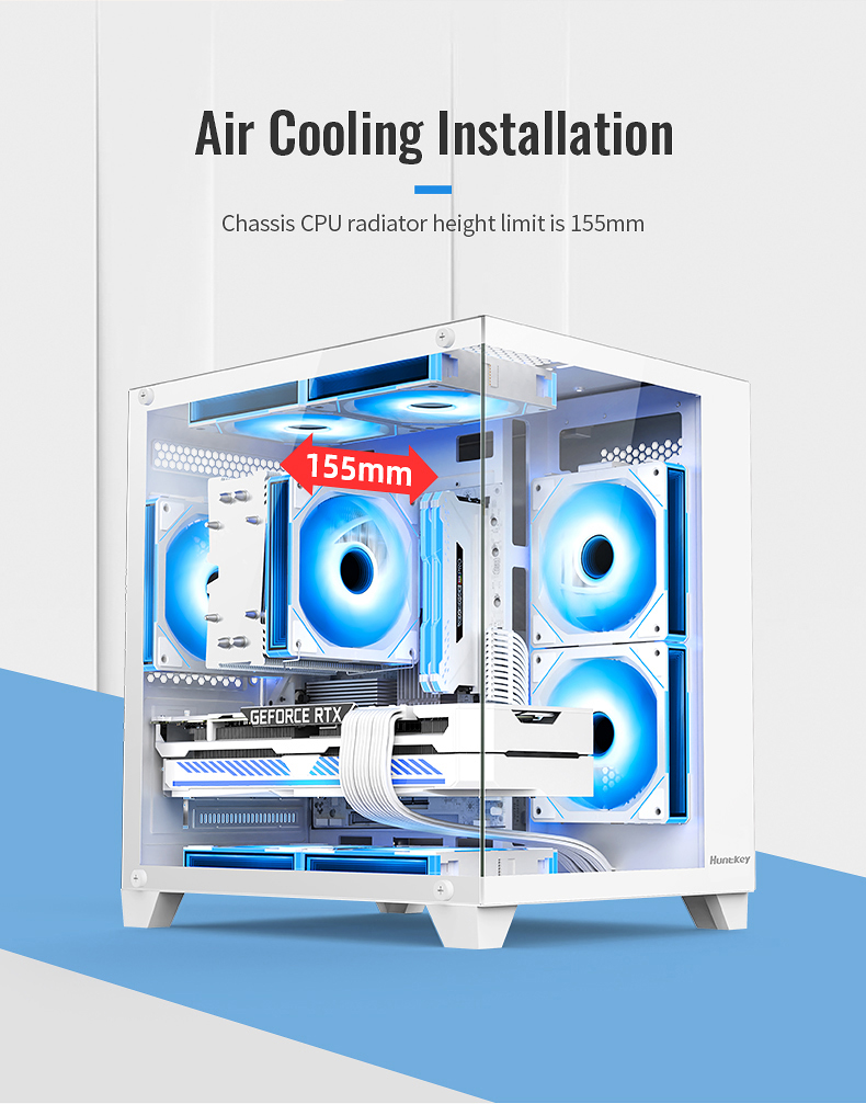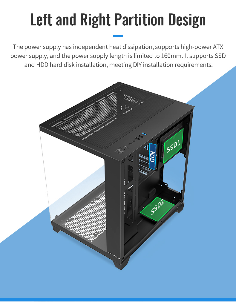 | Features | 1.Support RTX4060 VGA card 2.Support 7pcs system fan Max 3.Top or Side 240 Liquid Radiator 4.Front and Left transparent glass panel |