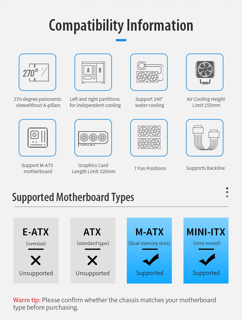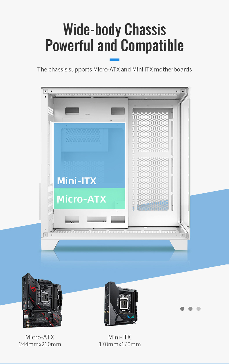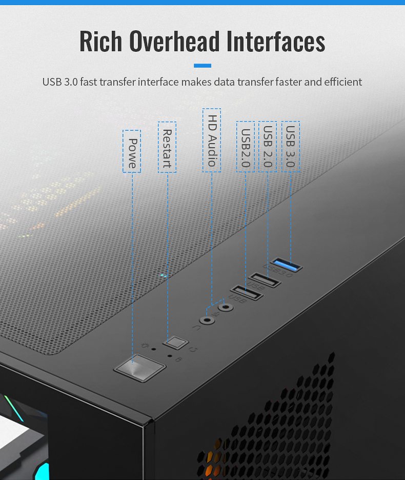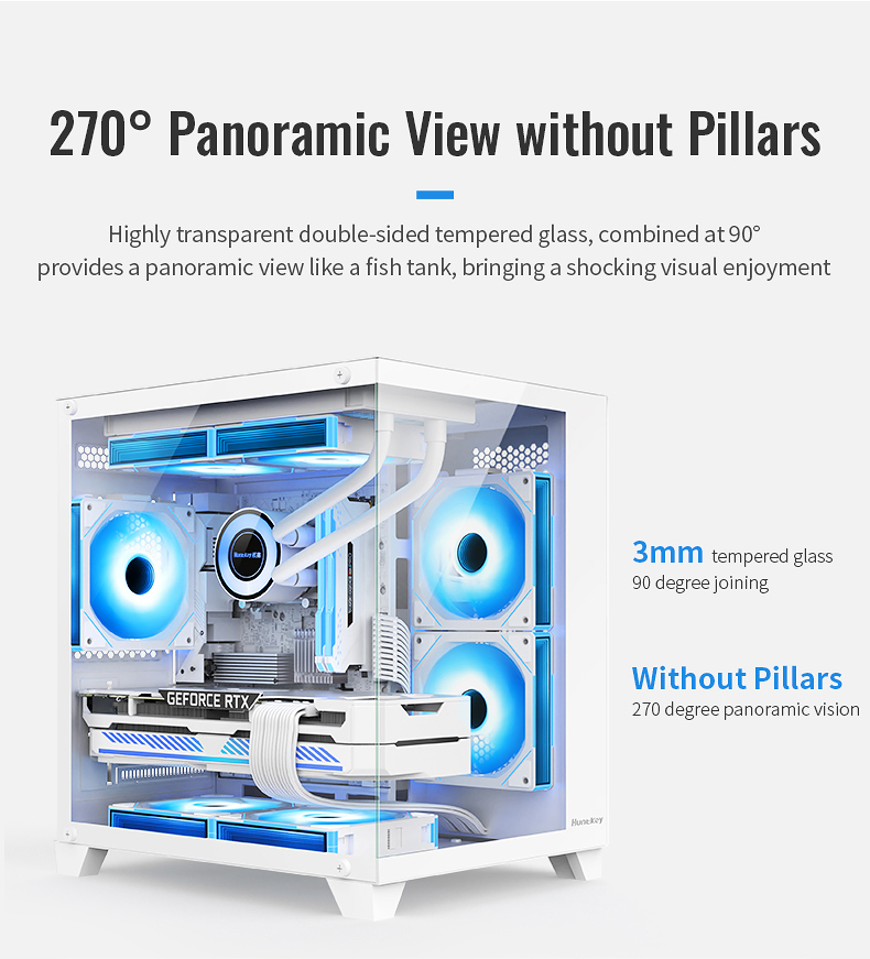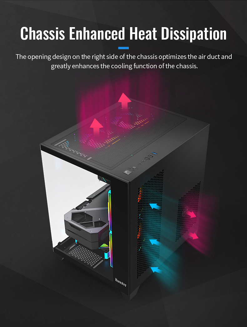 | Features | 1.Support RTX4060 VGA card 2.Support 7pcs system fan Max 3.Top or Side 240 Liquid Radiator 4.Front and Left transparent glass panel |