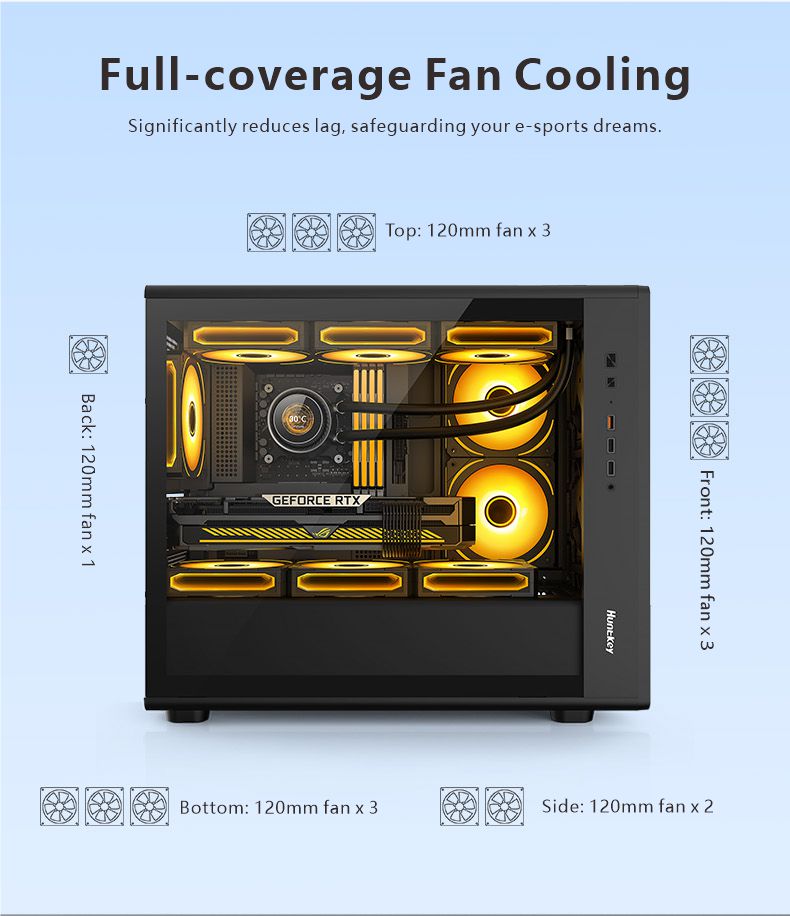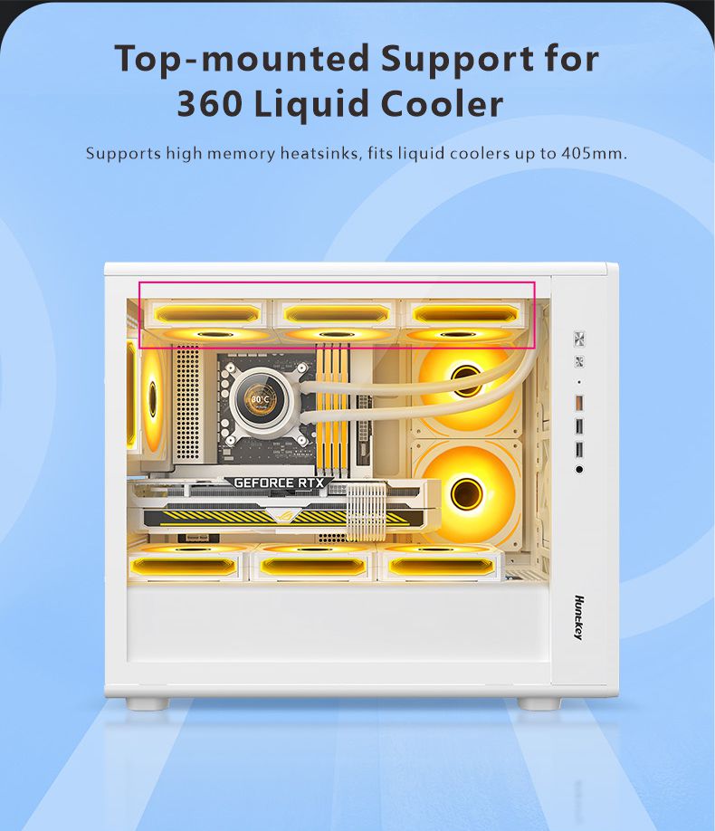 | Key Features | 1.Mesh style 2.Top 360 Liquid Radiator 3.Up to support system fan*12 |