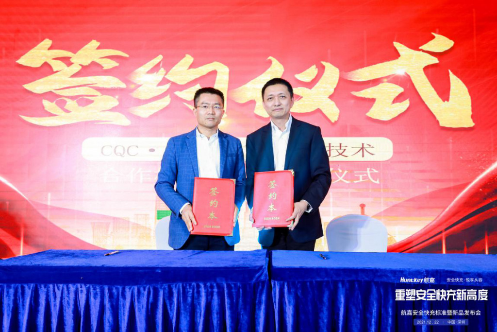 At the same time, when the safe fast charging standard was released, CQC and Huntkey Group signed a safe fast charging technology cooperation framework agreement, which represents that CQC will jointly promote safe fast charging industry standards with Huntkey in the future. Ming Han, Deputy Director of CQC (Shenzhen Branch), and Guirong Ye, Vice President of Huntkey, signed the contract.