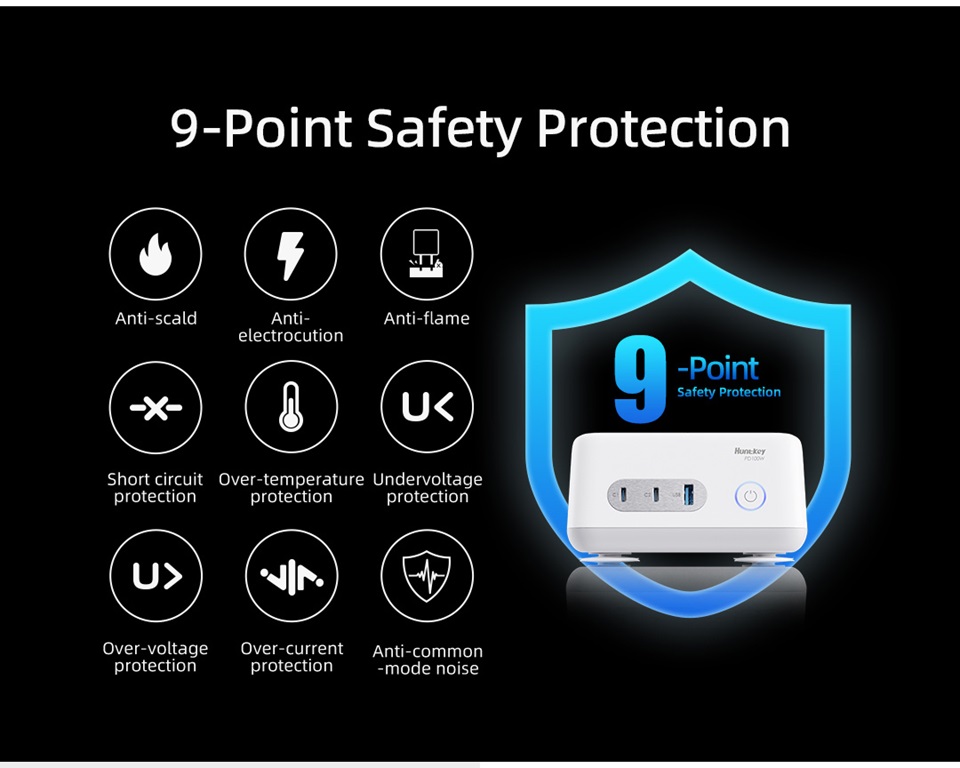 • Anti-electrocution, SCP, OTP, UVP, OVP, OCP