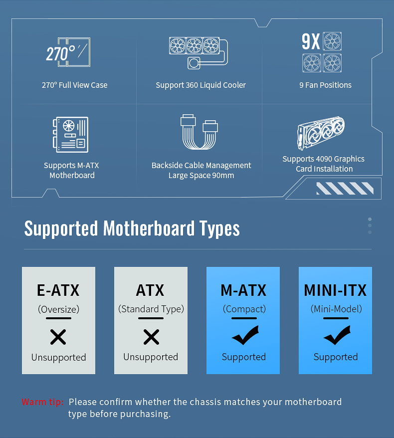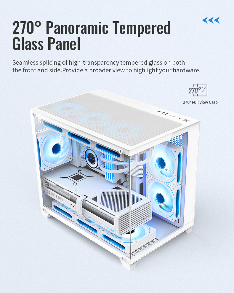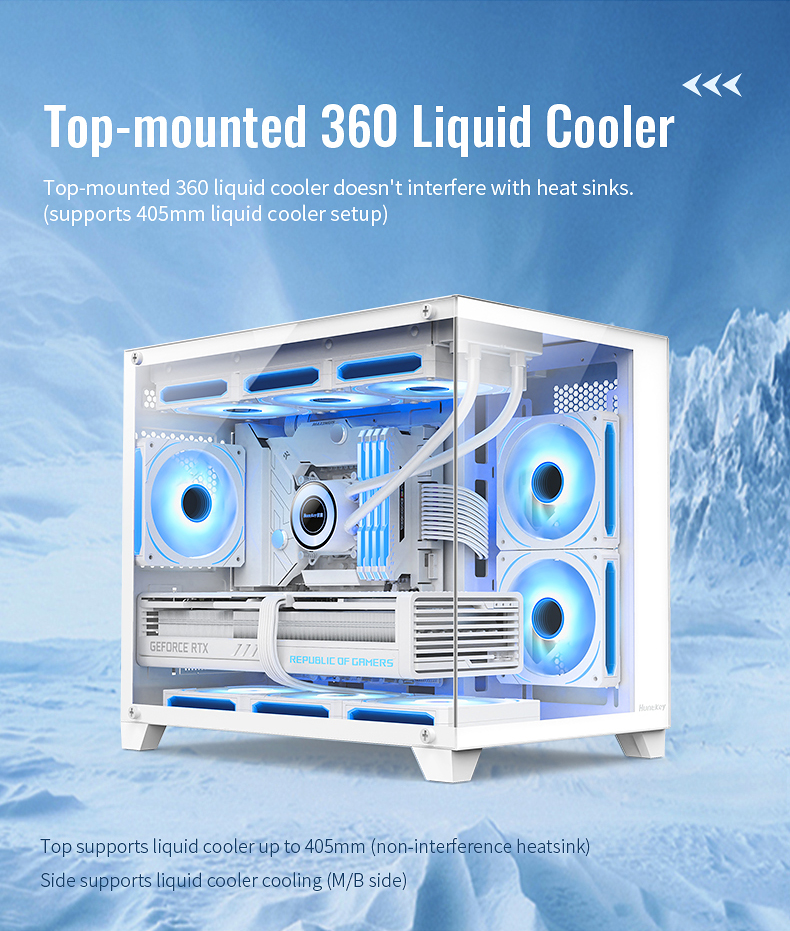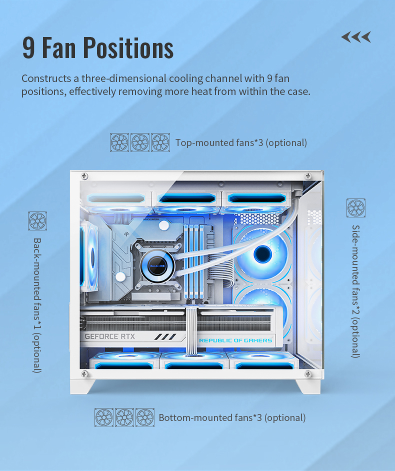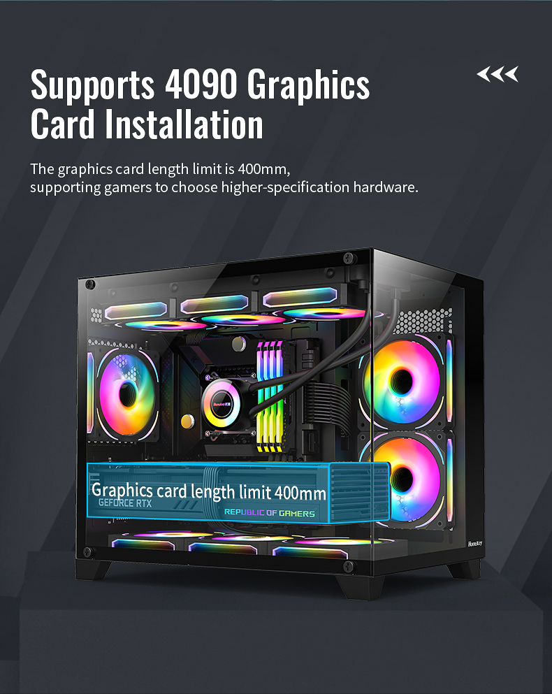 | Key Features | 1.Support RTX4090 VGA card 2.9pcs system fan 3.Top 360 Liquid Radiator 4.Front and Left transparent glass panel |
