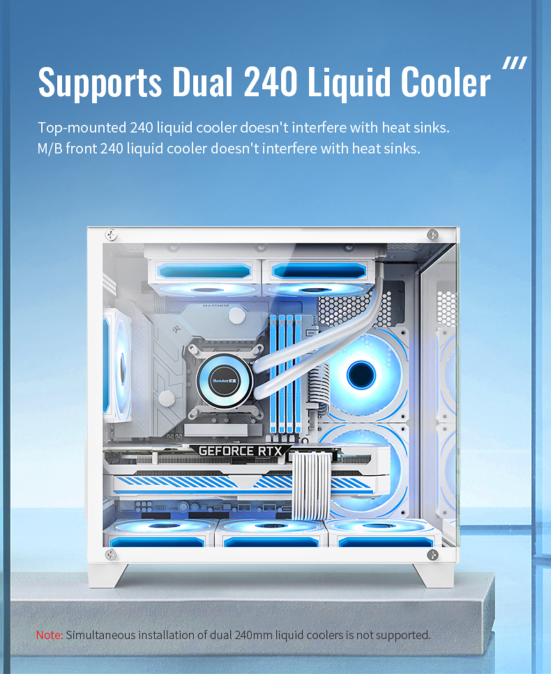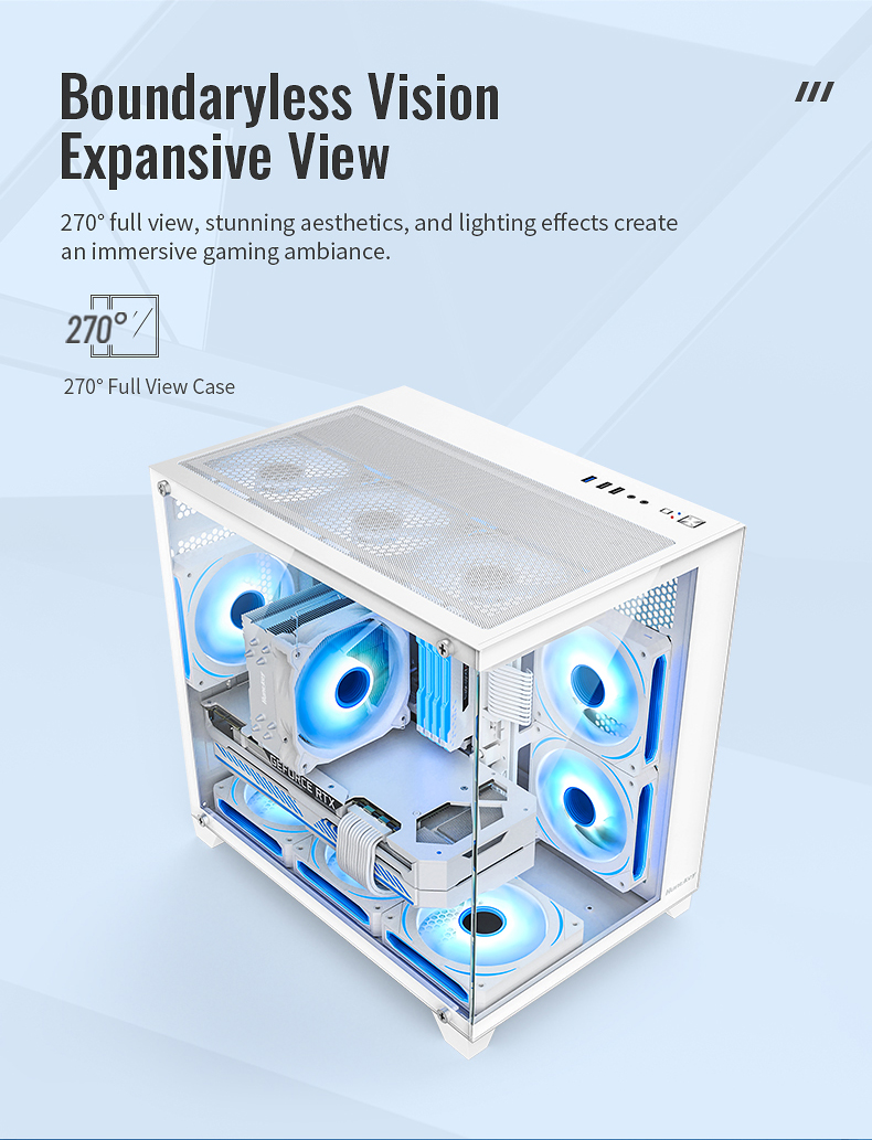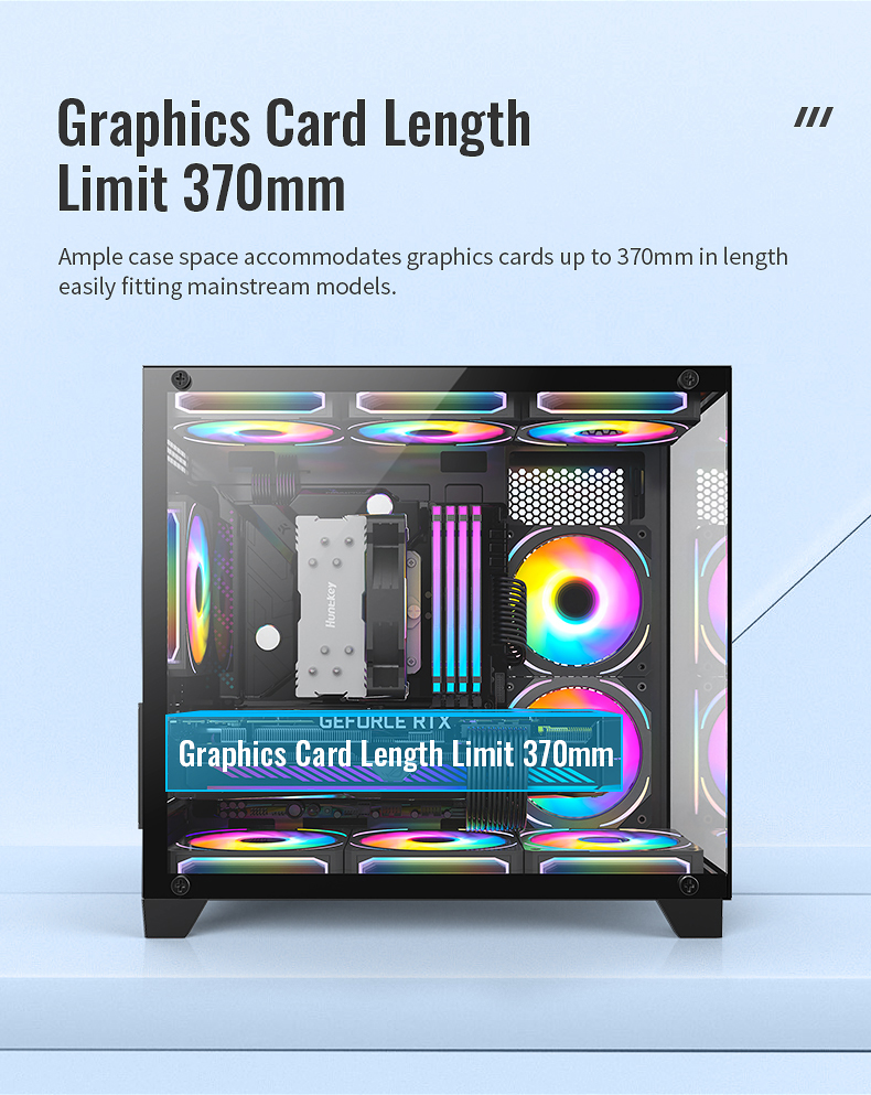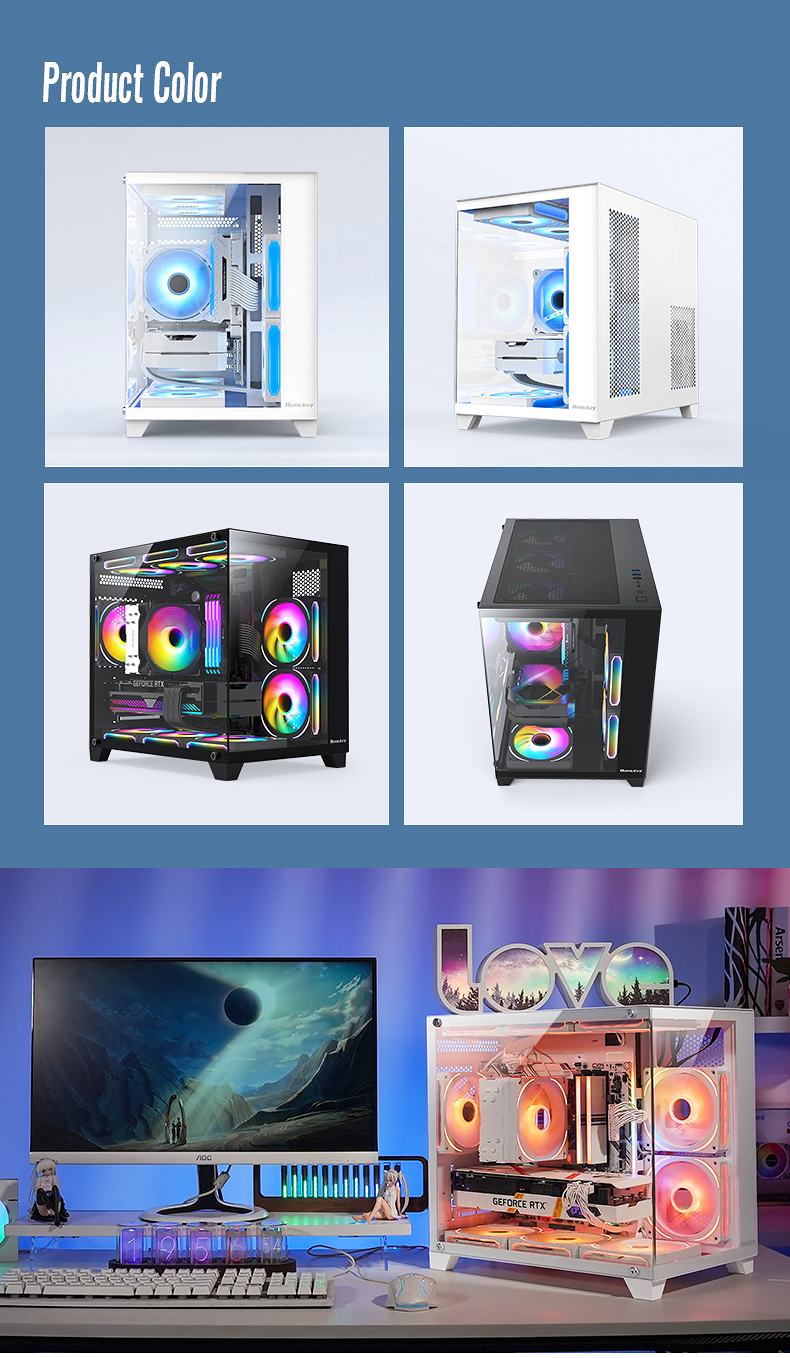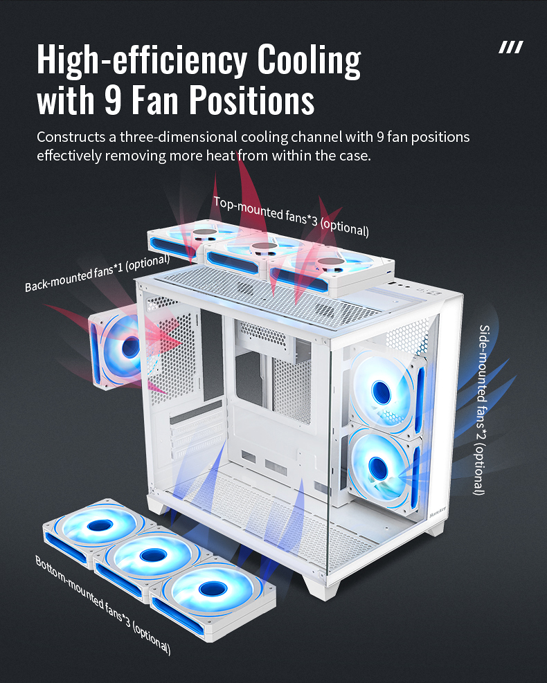 | Features | 1.Support 50 series VGA card 2.Max support 9pcs system fan 3.Top or Side 240 Liquid Radiator 4.Front and Left transparent glass panel |