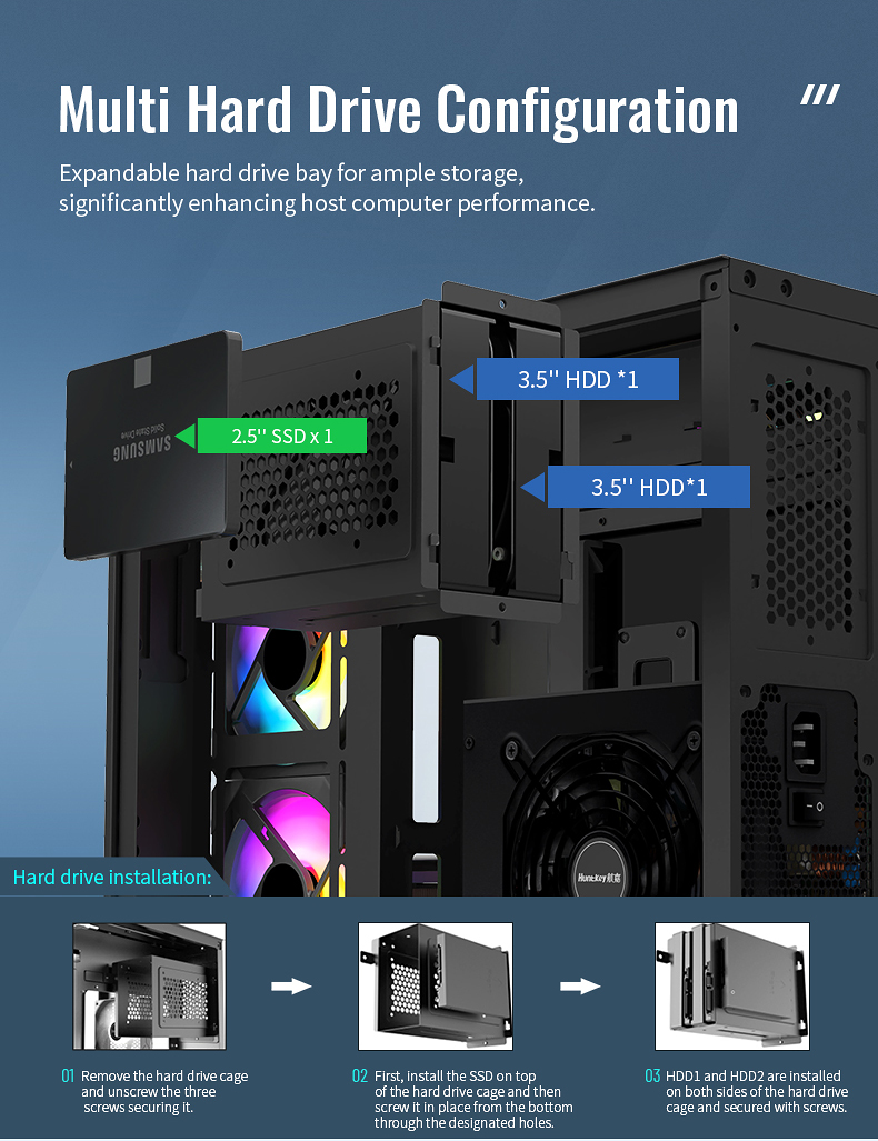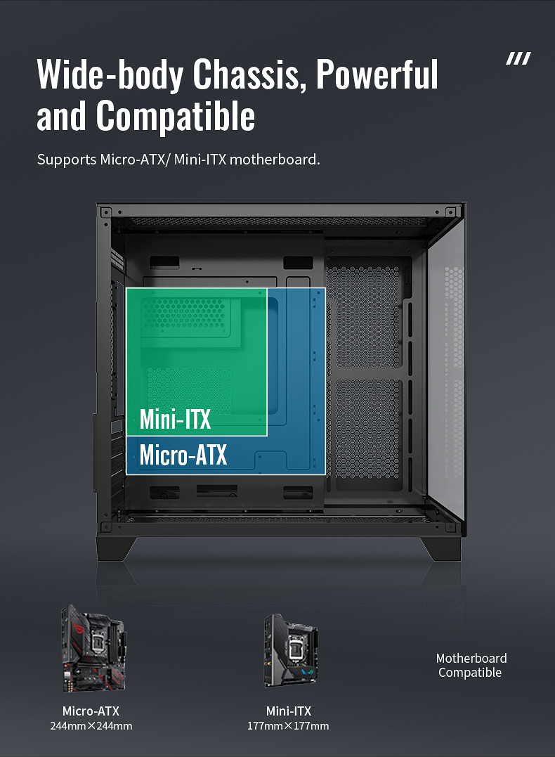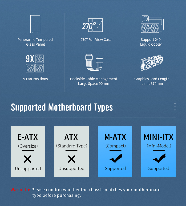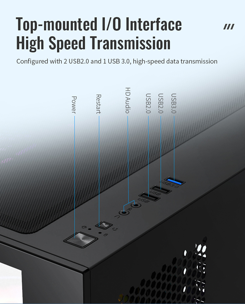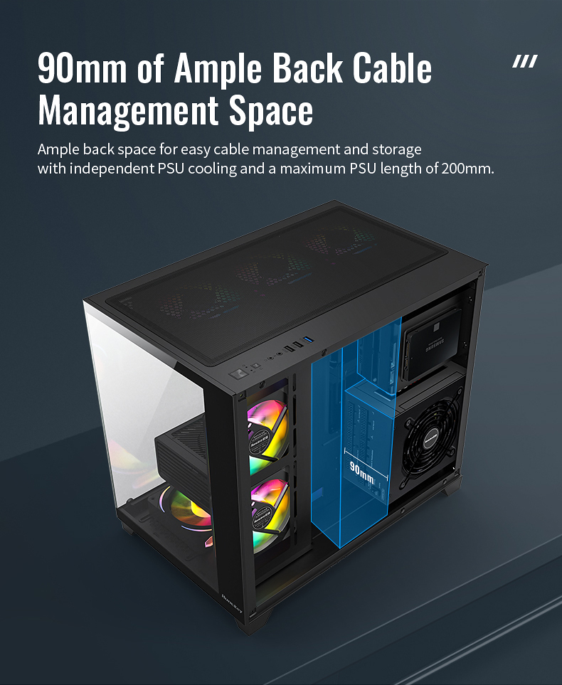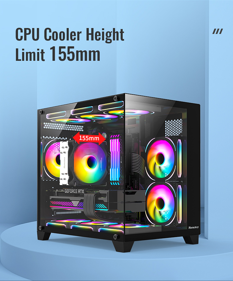 | Features | 1.Support 50 series VGA card 2.Max support 9pcs system fan 3.Top or Side 240 Liquid Radiator 4.Front and Left transparent glass panel |