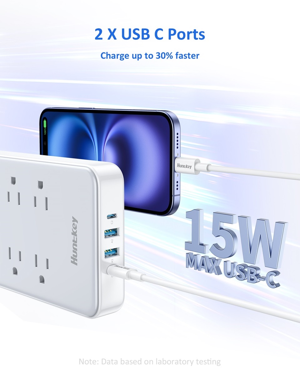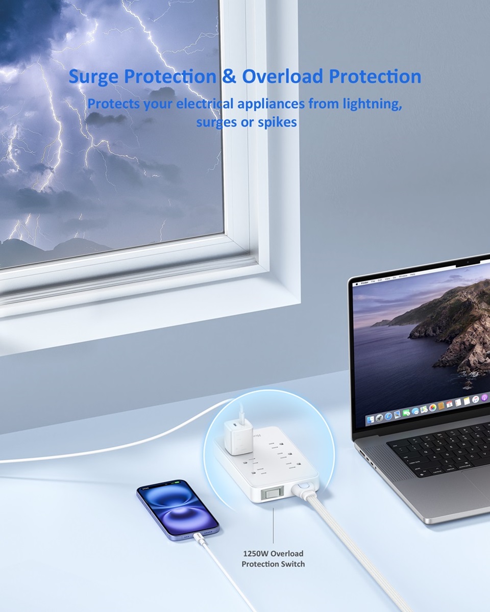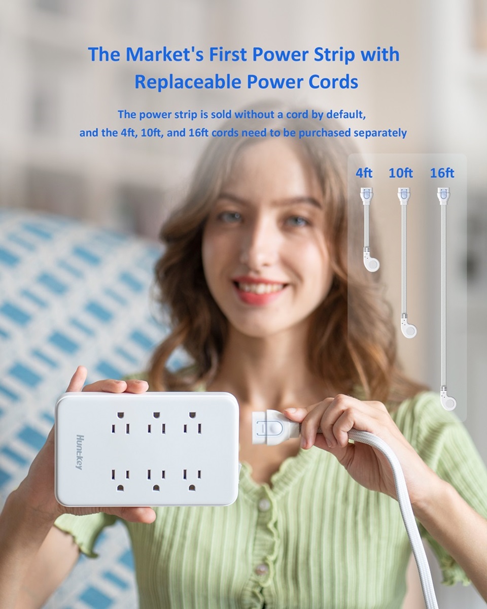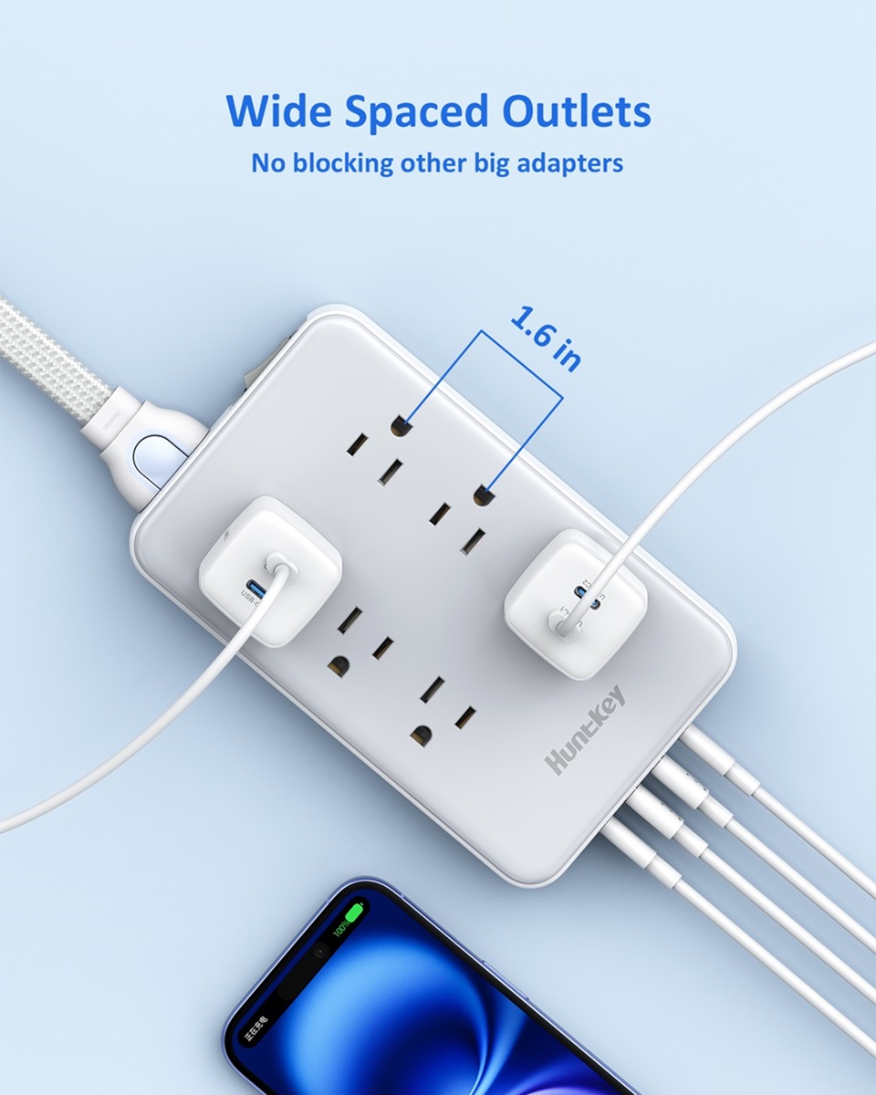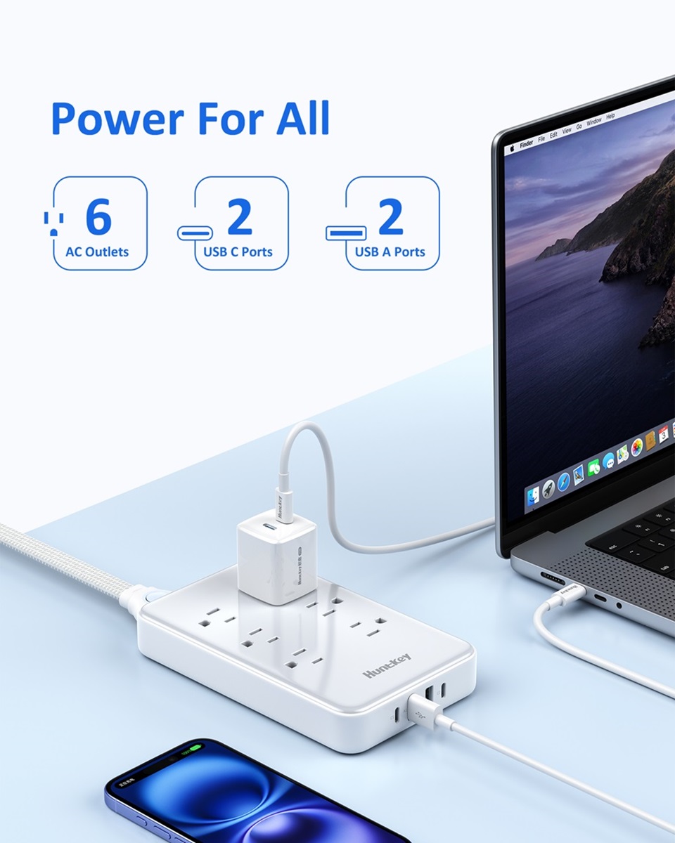 • Surge Protection & Multiple Charging Options – Huntkey Power Strip with surge protector keeps your devices safe. Features 6 AC outlets (1250W/10A) and 4 USB ports (2 USB-C, 2 USB-A) with a combined 15W output for charging phones, tablets, and more.