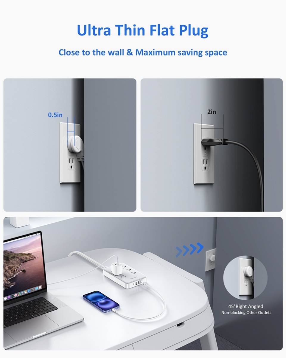 • Space-Saving Flat Plug – 45° angled ultra-slim flat plug fits behind furniture and tight spaces without blocking adjacent outlets, providing a clean, unobtrusive look.