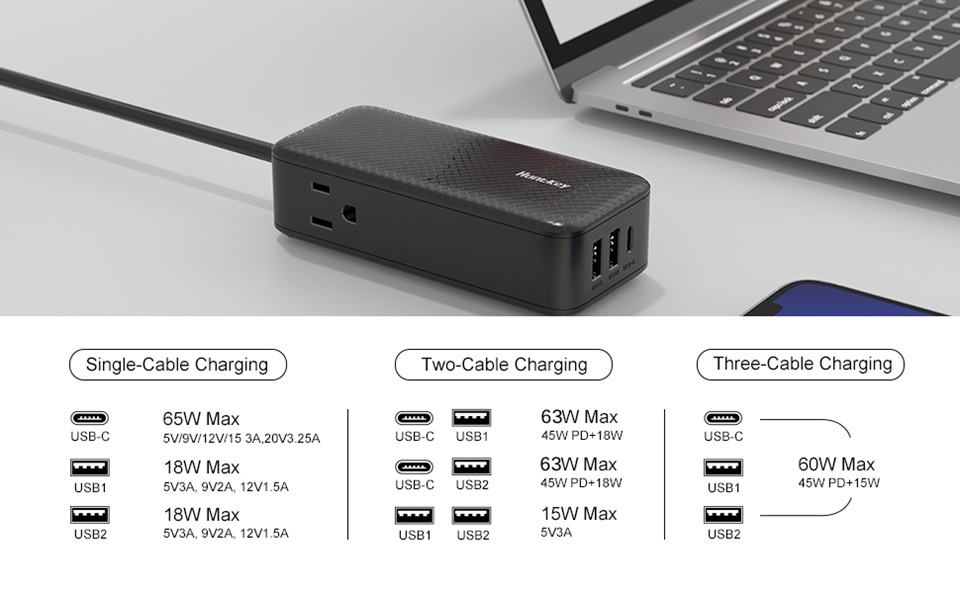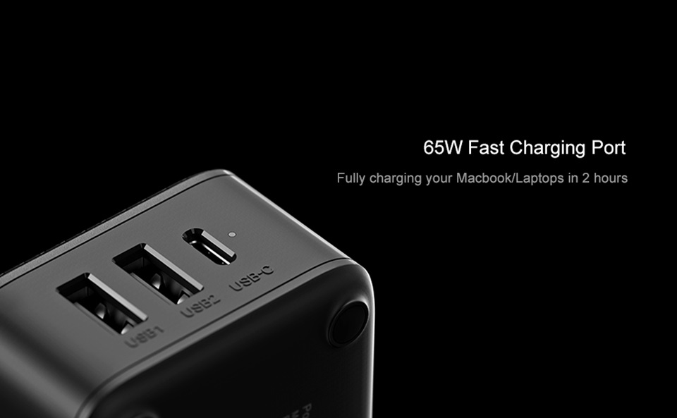 • 2 USB-A and 1 USB-C Output: Max 65W