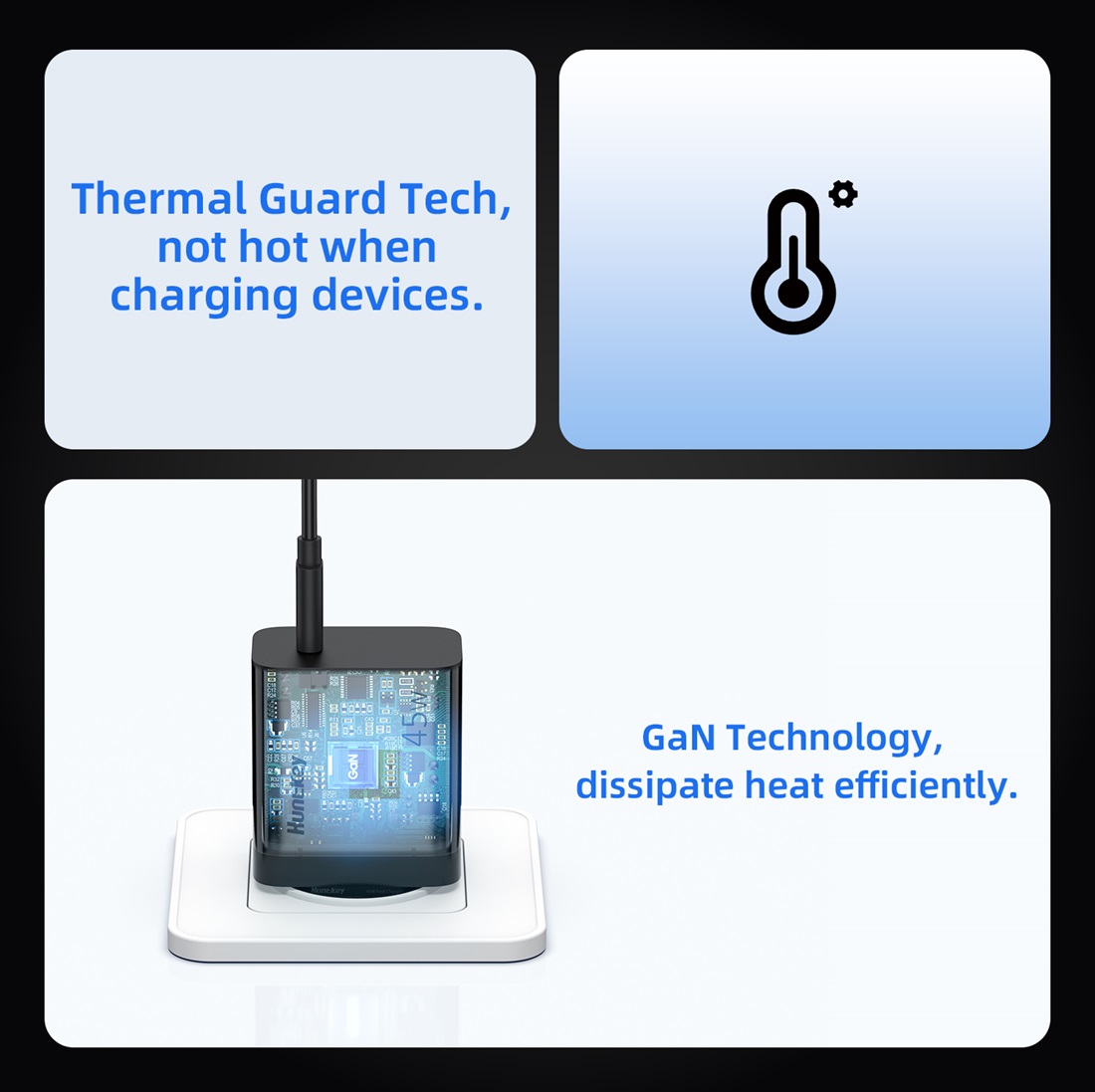 4. GaN technology: efficiently save energy and dissipate heat, making charging safer;